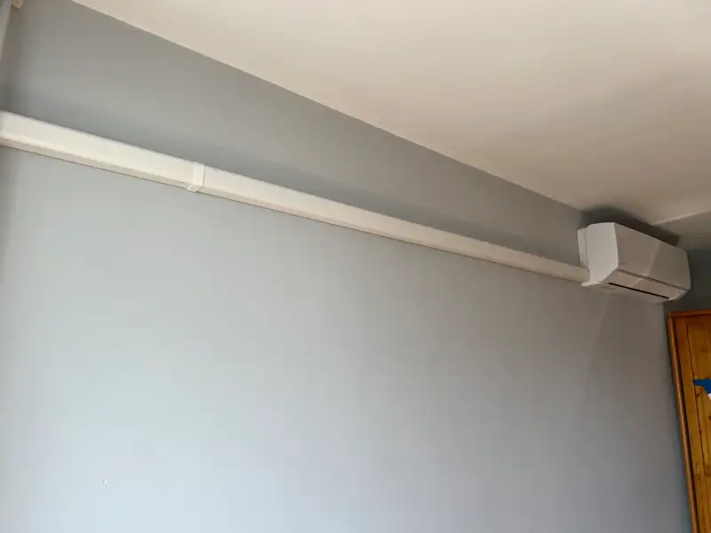A lakás elrendezése miatt a szoba és az erkély között egy nyílászáró, egy erkélyajtó található. Mivel a klíma csöveit nem lehet az ajtó mellett esztétikusan elvezetni, a nyílászárót megkerülve kellett kialakítani a csövezést.